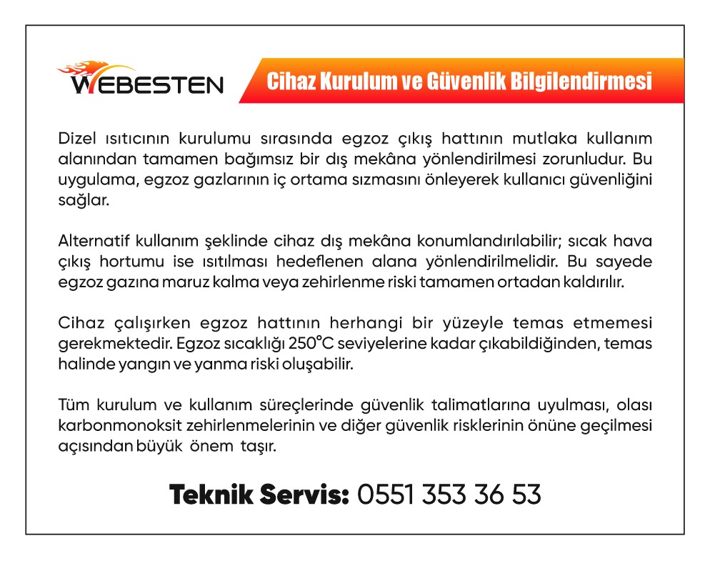 Dizel ısıtıcının kurulumu sırasında egzoz çıkış hattının mutlaka kullanım alanından tamamen bağımsız bir dış mekâna yönlendirilmesi zorunludur. Bu uygulama, egzoz gazlarının iç ortama sızmasını önleyerek kullanıcı güvenliğini sağlar.Alternatif kullanım şeklinde cihaz dış mekâna konumlandırılabilir; sıcak hava çıkış hortumu ise ısıtılması hedeflenen alana yönlendirilmelidir. Bu sayede egzoz gazına maruz kalma veya zehirlenme riski tamamen ortadan kaldırılır.Cihaz çalışırken egzoz hattının herhangi bir yüzeyle temas etmemesi gerekmektedir. Egzoz sıcaklığı 250°C seviyelerine kadar çıkabildiğinden, temas halinde yangın ve yanma riski oluşabilir.Tüm kurulum ve kullanım süreçlerinde güvenlik talimatlarına uyulması, olası karbonmonoksit zehirlenmelerinin ve diğer güvenlik risklerinin önüne geçilmesi açısından büyük önem taşır.